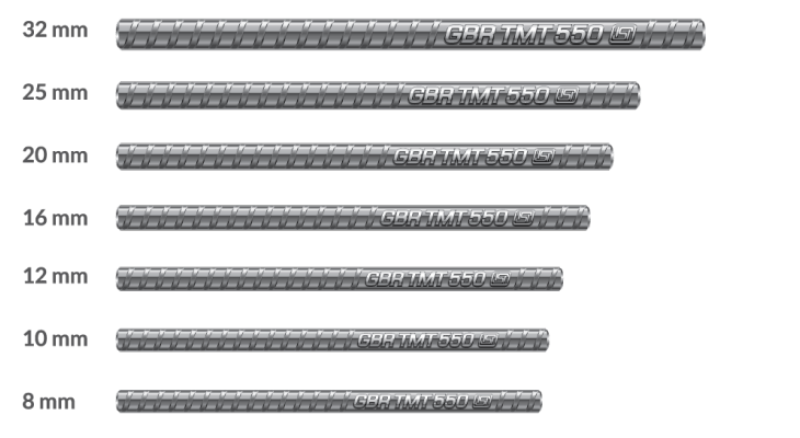 GBR TMT is available in the following sizes, as per the IS 1786:2008.